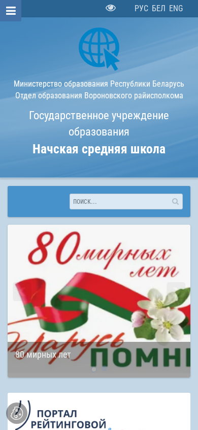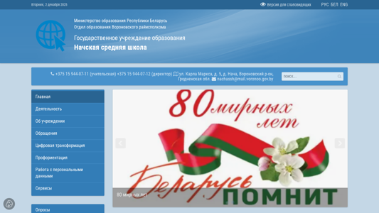 | AI-анализ | The website is for the Nachska Srednja Shkola, a secondary school located in the Voroновsky region of Grodnenska oblast, Belarus. The title and description of the website are in Belarusian. Keywords include 'education', 'school', 'news', 'November', and 'detailed information'. The top_words indicate various news topics, including 'region', 'industry', and 'crisis situation'. The website contains information about the school, its news, and various educational events. It also includes contact information for the school, including phone numbers and an email address. The school's address is given as ul. Karla Marksa, d. 5, d. Nacha, in the Voronovsky region. The website has a section for parents with information on what to do if their child is experiencing a crisis situation. The school |
