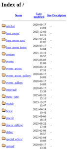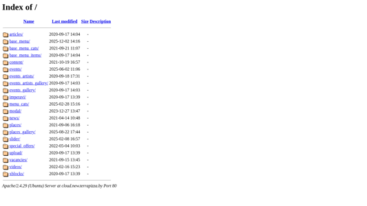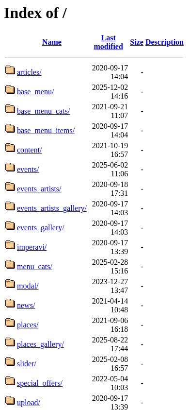 | AI-анализ | This online resource is a website, operated under the .BY domain (Belarus), with a title of "Index of /" and a description that is empty. The keywords associated with the site include "menu," "events," "base," "gallery," "artists," "places," "name," "last," "modified," "size," "description," "articles," "2020-09-17," "2025-12-02," "2021-09-21," "items," "content," "2021-10-19." The site structure consists of various folders and files such as "articles," "base_menu," "base_menu_cats," "base_menu_items," "content," "events," "events_artists," "events_artists_gallery," |