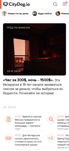 | AI-анализ | The website CityDog.io is a lifestyle journal that brings together the Belarusian creative class from Minsk, Belarus, and various countries worldwide. We tell stories about important events, interesting people, and places, and help them grow and live better. The website covers topics such as People and Stories, News, Places, Guides, Trends, Mom, Dad, and Kids, Quarters Rental, History, and more. Some recent articles include "A Belarusian girl starting to sell sex at the age of 19 to get out of poverty," "Want to get rid of high heels? Choose between biker boots, flats, and high-heeled sandals – from 65 to 250 rubles," "I'm doubting if it's possible to get married for less than 10,000$," and "A Bel |