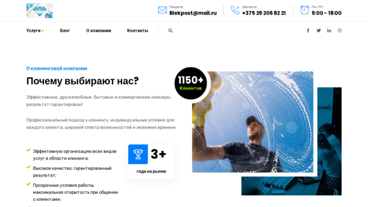 | AI-анализ | This online resource is a cleaning company website named "Чысціня бай" (Chyscinya Bay) that offers comprehensive cleaning services for residential and commercial properties in Belarus. The website states that they perform cleaning tasks efficiently, confidentially, and at a reasonable price. The title and description keywords indicate that their services include cleaning offices, windows, plumbing, carpets, soft furniture, floors, and decontamination. They also offer floral design and decoration, technical maintenance, and landscape design. The company can be contacted via email at Blekpost@mail.ru or by phone at +375 29 206 82 21, and their operating hours are from 9:00 to 18:00, Monday to Friday. The website provides information on their company, services, and contact details. The company prides itself on having |