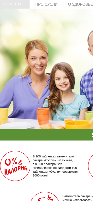 --- This website is the homepage for the product "Сусли" (Susli), a sugar substitute. It provides information on the product's benefits, such as its low calorie count and ability to prevent tooth decay. The website states that Susli is a combination of two intensive sweeteners, saharin and cyclamate, which provide a similar taste to sugar while minimizing the metallic and bitter tastes associated with each individually. Susli is also noted for its quick dissolution in water, making it suitable for use in various beverages. The website mentions that one Susli tablet is as sweet as one teaspoon of sugar, and that 650 tablets can replace 4.5 kg of sugar. The website also includes a safety notice, stating that the recommended daily intake of Susli is one tablet for every 4 kg of body weight. The domain is susli.