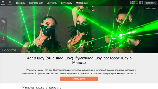 | AI-анализ | --- This website is dedicated to the event production company ILLIZIUM, offering various types of shows including fire shows, light shows, and paper shows for events of any scale, such as graduations, weddings, and corporate events. The website provides detailed information about the different show options, their durations, and pricing. Fire shows include "Rock" and "Jazz" versions, with durations of 3-5 minutes and 12 minutes respectively. Other offerings include pixel shows, laser shows, and even a clown show. The website also includes contact information for the company. Top keywords for this website include "show", "Minsk", "fire", "paper", and "ILLIZIUM". |