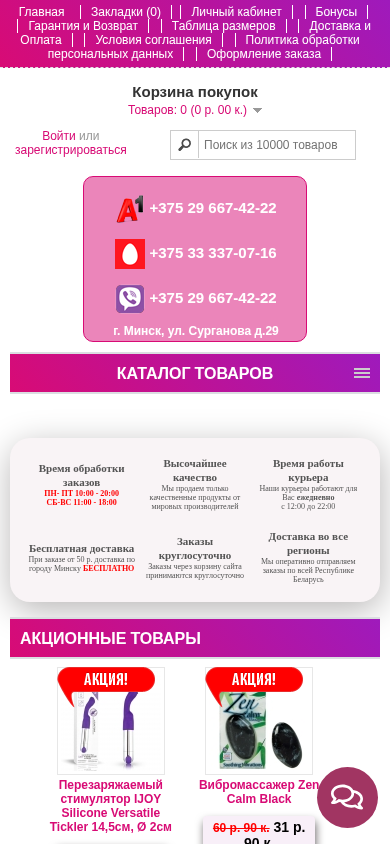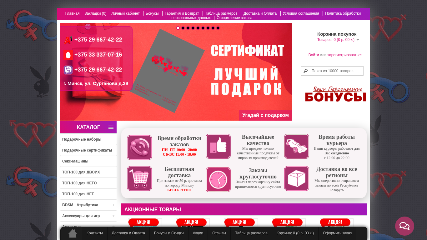 | SEO-описание | Крупнейший ❤ Секс-Шоп рад предложить Вам широчайший ассортимент интимных товаров и секс-игрушек с бесплатной доставкой в Минске и РБ. ✔ Более 15 тысяч товаров ✔ Online интим магазин ✔ Интернет-магазин интимных товаров с анонимной доставкой по Беларуси! |