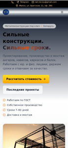The portal is a manufacturing and installation company for metal structures, TechnostalIngining (TSE), based in Minsk, Belarus. They specialize in the production and mounting of metal structures such as garages, sheds, beams, frames, and roof trusses for clients across Belarus. The website provides information on production processes, benefits, projects, contacts, and frequently asked questions. The company works with both corporate and individual clients, adheres to deadlines, and ensures product quality. Users can request a quote for various metal structures including metal frames, columns, supports, riggings, and metal carports. TSE also offers a full cycle of design, manufacturing, and installation of metal structures. The website is available at tsebel.by.