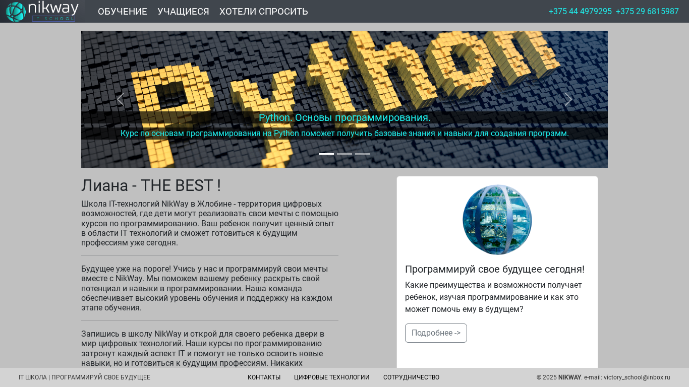 | SEO-описание | Мир цифровых технологий с IT школой NikWay. Курсы по программированию для детей в г. Жлобин. Языки программирования Python, HTML, JavaScript, Kotlin, SQL - создайте свое будущее уже сегодня! Наши опытные преподаватели обеспечат комфортное и интересное обучение, а ребята смогут создавать свои собственные проекты и приложения. |