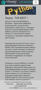 | AI-анализ | This website is an IT school named NikWay, based in Zhobin, Belarus. It offers courses in programming for children using languages such as Python, HTML, JavaScript, Kotlin, and SQL. The website emphasizes the importance of starting IT education early and encourages students to create their own projects and applications. The top keywords for this website include "IT school," "programming for children," "algorithms," and "development of modern websites and applications." The website also mentions courses in web development and the creation of Android applications. The contact information provided includes a phone number for inquiries. |