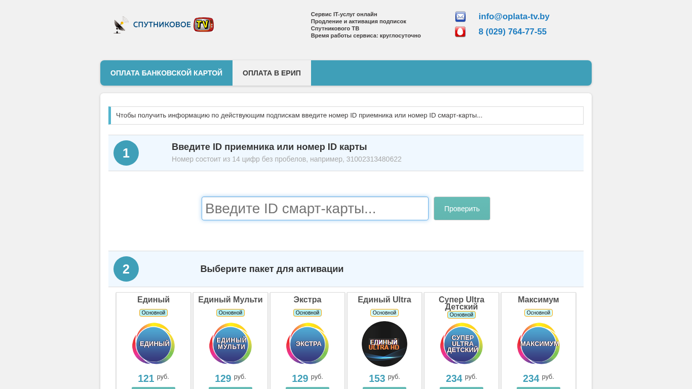 | AI-анализ | The portal Oplata-TV is a website dedicated to the activation and extension of subscriptions for Satellite TV. It offers online payment services for Satellite TV and provides information about various packages, their prices, and subscription numbers. Users can pay for their subscriptions using bank cards or through the ERIP system. The website also includes options for Viber and WhatsApp chat support. The available packages include Basic, Multi, Extra, Ultra, Super, and Maximum, with different prices and durations. Users can pay for a one-time subscription or for longer periods, such as 180 days or a month. Some additional features like UFC TV, Multiroom, Ultra HD, MATCH PREMIER, and MATCH! Football also have separate payment options. The website requires the user to enter their receiver ID or card number to access information about their current subscriptions. |