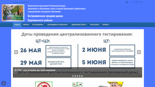 | AI-анализ | The web project "Bogushevichskaya Srednya Shkola Berezinskogo Rayona" (Bogushevich Secondary School in Berezino District) is a site managed by the Belarusian Ministry of Education. It provides information about the school, its administration, educational programs, and contacts for parents and students. The site includes a schedule of admission procedures for the 2025/2026 academic year, an interactive map, and information on various school projects such as "School of the Active Citizen" and "Creating an Eco-Oriented System of Extracurricular Activities." The site also offers resources for students, including thematic lessons on "My Family, My Homeland," and a cafeteria menu. The site is governed by a set of documents that regulate its functioning, and includes a policy |