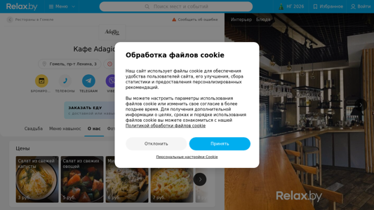 | AI-анализ | This website is for the Adagio (Адажио) Cafe in Gomel, Belarus, located on Lenina Prospect 3. The site offers a menu with prices and photos, customer reviews, the address on a map, and online table reservation through Relax.by. The keywords include 'banquet hall' and 'Adagio (Адажио) Gomel'. The top words are 'cafe', '2025', 'cookie', 'menu', 'Adagio', 'Адажио', 'все', 'руб', 'гомель', 'отзывы', 'фото', 'отзыв', 'января', 'написать', 'файлов', 'пр-т', 'ленина', 'цены', 'интерьер', 'гостей'. The unp number is |