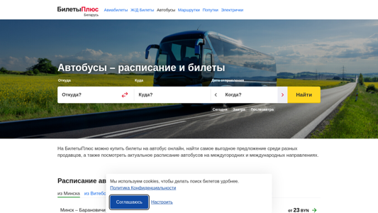 | AI-анализ | This online resource offers users the ability to purchase bus tickets online, find the most cost-effective deals from various vendors, and view current bus schedules for both domestic and international routes. The website provides bus schedules (as of December 1, 2025) for various destinations including Minsk-Baranovich, Minsk-Bobruisk, Minsk-Borisov, and Minsk-Vitebsk, among others. Prices for a one-way ticket range from 5 BYN for a trip from Minsk to Lогойск to 158 BYN for a trip from Vitsebsk to Gorodok. The domain is bus.biletyplus.by. |