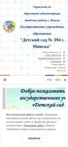 | AI-анализ | The website "Детский сад 394" (Children's Kindergarten No. 394) is an educational institution located in Minsk, Belarus. The website provides information on the kindergarten's administration, opening hours, contact details, and services offered. Visitors can find details on the registration process, administrative procedures, and various policies including the policy on handling personal data. The website also includes sections on the kindergarten's history, traditions, and various initiatives such as anti-corruption activities and informational-propagandistic work. The structure and functions of the administration are outlined, along with a description of their unique features and conditions for admission. The website is operated by the Ministry of Education of the Zavodsky District of Minsk. The website uses cookies and requires user agreement with the site's data processing and protection policy. The contact information, |