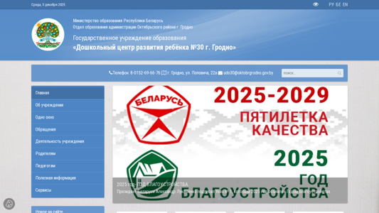 | AI-анализ | This website is for the State Educational Institution "Preschool Center for Child Development No. 30" located in Grodno, Belarus. The title of the website is "Дошкольный центр развития ребёнка № 30 г. Гродно" which translates to "Preschool Center for Child Development No. 30 in Grodno". The description includes information about the Ministry of Education in Belarus and the October District Administration of Grodno. The website provides recommendations for parents of incoming first-graders in 2025, as 2025 has been declared the Year of Bлагоустройство (improvement) by the President of Belarus. The website also mentions the assessment of the quality of services and administrative procedures of the preschool center and the importance of feeding children in the institution. |
