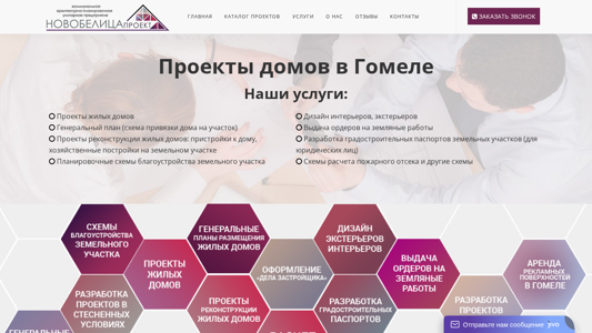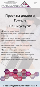This online resource, titled "Заказать проект у НовобелПроект - оченly просто. А главное выгодно!" (Order a project from NovoBelProject - it's very simple. And most importantly, it's affordable!), is a website dedicated to offering project services in the field of architecture and construction. The main focus of the site is on selling and ordering various types of architectural projects, such as home projects, reconstructions, and planning schemes, in the city of Gomele, Belarus. The website also offers design services for interiors and exteriors, as well as order processing for land works and the issuance of development permits for legal entities. The site provides a selection of completed projects, information on their services, and contact details for ordering and inquiries. The company has been operating for over 6 years and boasts a