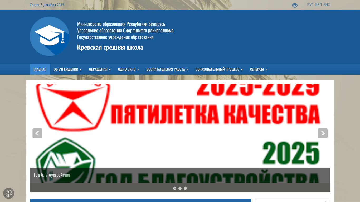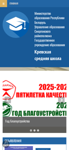 | AI-анализ | The web project "Krevskaya Secondary School" is a state educational institution managed by the Ministry of Education of the Republic of Belarus and the Smorgon District Executive Committee. The website provides information about the school, its leadership, pedagogical staff, and various tasks and functions. It features news, a visit card for the institution, and information on its history, traditions, and achievements. There are sections on the library, media center, and school museum, as well as information on methods of handling personal data. The website offers paid services, and includes a section on anti-corruption measures. It also features information on the school's policies, normative documents, and contact details, including a hotline and administrative procedures. The website provides information on various educational activities, including events for different age groups and volunteer opportunities. It also includes a section on school safety, including anti-drug and cybersecurity information. The |
