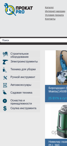 | AI-анализ | The portal ProkatPRO is a Belarusian .BY e-commerce website specializing in renting construction tools, electric tools, and repair equipment in the city of Gomel. The catalog offers a wide range of products including building equipment such as compressors, heaters, and saws, as well as electric instruments like drills and grinders, and even garden tools. The rental period is flexible, with the option for customers to rent for any duration. The website includes a contact section with a phone number and business hours. The products listed are building equipment (electro stations, compressors, thermal pumps, motor pumps, construction woods, ladders and stairways, welding equipment, vibrating plates, concrete mixers and miners, electric tools (measuring tools, perforators, sledgehammers, drills, angle grinders, shaping machines, grinding machines, screw |