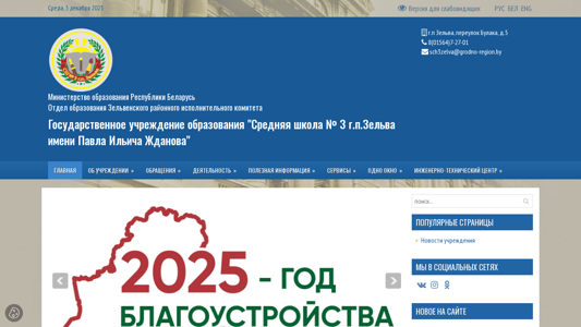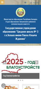 | AI-анализ | This online resource is the official website of Middle School No. 3 in Zhelva, Belarus. The website provides information about the school, including its administration, news, and contact details. The school is named after Pavel Ilyich Zhdanov and is located at Per. Bulak, d.5 in Zhelva. The Ministry of Education in the Republic of Belarus oversees the school. The website includes sections on the school's logo and emblem, visiting card, and working hours. It also features information on the school's union, veterans, licensing, anti-corruption activities, work with gifted students, and parent-teacher communications. There are also sections on ideological and educational work, military-patriotic education, and various achievements of Belarus. The website includes a page for a pedagogue-psychologist and a social pedagogue, |