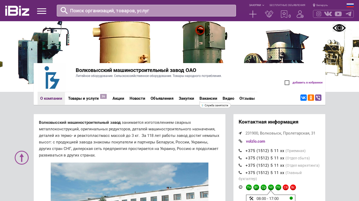 favicon Волковысский машиностроительный завод ОАО - Литейное оборудование. Сельскохозяйственное оборудование. Товары народного потребления. . 231900, Волковыск, , Пролетарская, 31