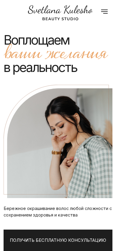 The portal Svetlana Kulesho Beauty Studio offers hair coloring services of any complexity while preserving health and quality. Get a free consultation from the top colorist and studio founder. The studio of beauty by Svetlana Kulesho is a space that combines style and comfort, beauty and coziness, warmth and care. Visiting our studio, you will be in the hands of qualified professionals who will help you make your choice and create an unique look for you. "We treat our clients' wishes with care and respect. From our cozy and comfortable studio, clients leave beautiful and refreshed". Svetlana is a highly qualified master-colorist with over 8 years of experience. She is also a technologist for Limba, a certified specialist in tritmentology and trichology, and trains colorists. The studio was founded by Svetlana Kulesho. Immer
