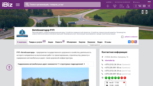 | Название / Заголовок | Витебскавтодор РУП - Ямочный ремонт струйно-инъекционным методом. Устройство поверхностной обработки. Устройство горизонтальной разметки. Производство асфальтобетонной смеси и битумной эмульсии. Инженерные услуги. Организация грузоперевозок. Аренда строительных машин.. 210026, Витебск, , Суворова, 16 |