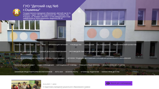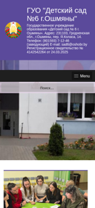 | AI-анализ | --- The web project "ГУО "Детский сад №6 г.Ошмяны" (State Educational Institution "Children's Kindergarten № 6 in Oshmyany") provides information about the kindergarten's location, contact details, and registration information. The kindergarten is situated in Oshmyany, Grodnen Oblast, Belarus, at Я.Коласа per., 14. The telephone number is (801593) 7-12-46, and the email address is sad6@oshobr.by. The kindergarten was registered on March 24, 2025. The website includes a menu with sections for annual reports, administrative procedures, work schedules, organizational structures, and normative documents. The website also provides information on worker responsibilities, the reception schedule |