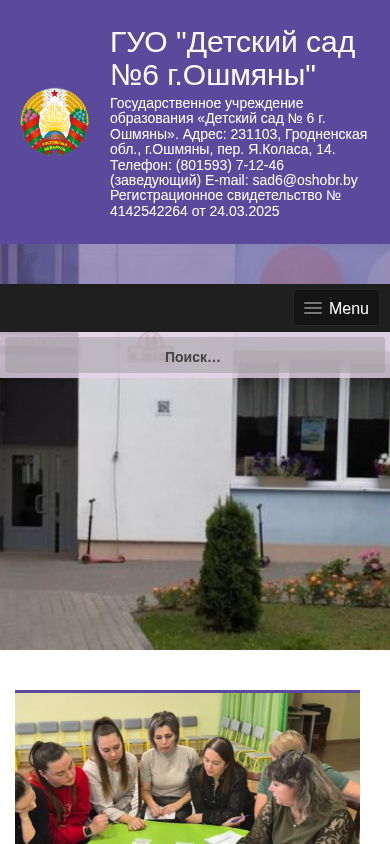 | Название / Заголовок | ГУО "Детский сад №6 г.Ошмяны" — Государственное учреждение образования «Детский сад № 6 г. Ошмяны». Адрес: 231103, Гродненская обл., г.Ошмяны, пер. Я.Коласа, 14. Телефон: (801593) 7-12-46 (заведующий) E-mail: sad6@oshobr.by Регистрационное свидетельство № 4142542264 от 24.03.2025 |