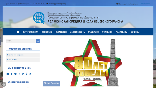 | AI-анализ | The website is for the "Лелюкинская средняя школа Ивьевского района" (Leлюкинская средняя школа Ивьевского района), a secondary school located in the village of Лелюки (Leluki), Iv'evsky District, Grodno region, Belarus. The homepage title is "Лелюкинская средняя школа Ивьевского района" (Leлюкинская средняя школа Ивьевского района) and the meta description includes information on the school, its location, and contact details, including a phone number and email address. The website's top keywords include "школа" (school), "учреждения" (institutions), "образования" (education), "работы" (work), and "ивьевского" (Iv |