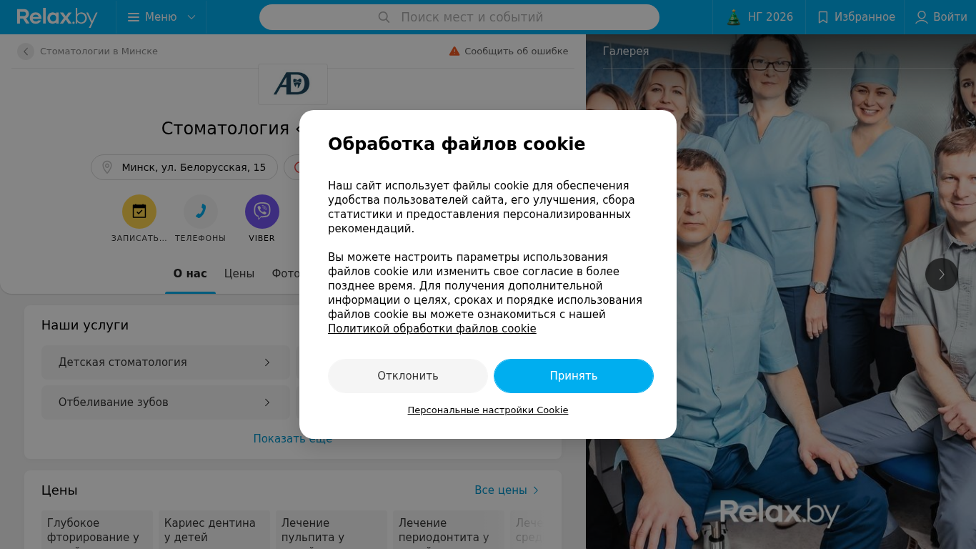 | AI-анализ | The portal 'AspectDent' is a dental clinic located in Ul. Belarusskaya 15, Minsk. The website provides patient reviews, contact information including phone numbers, operating hours, and a map for navigation on Relax.by. Keywords associated with the website include 'AspectDent', 'stomatology', 'Minsk', and 'dentistry'. The top words on the website are 'aspectdent', 'stomatology', 'all', 'make an appointment', 'stomatology services', 'cookie', 'review', 'children', 'ruble', 'teeth', 'specialists', 'you', and 'Minsk'. The dental clinic offers various services such as pediatric dentistry, therapeutic dentistry, teeth whitening, and aesthetic dentistry. The website lists prices for different procedures including deep tooth fading |