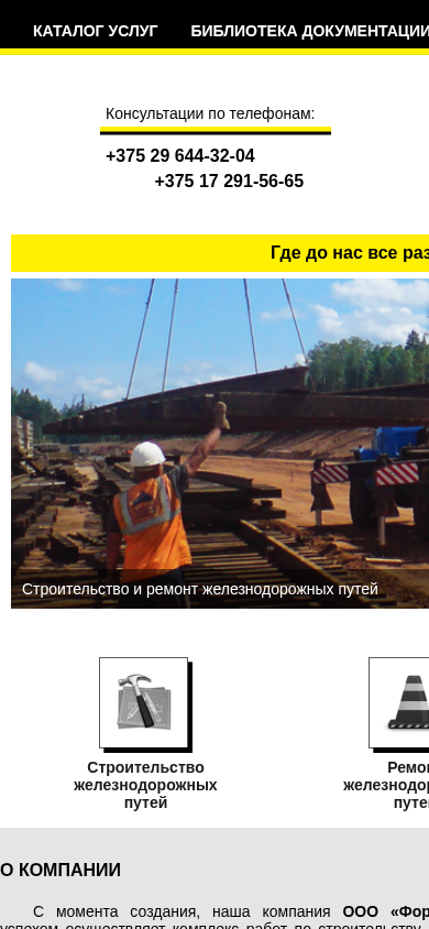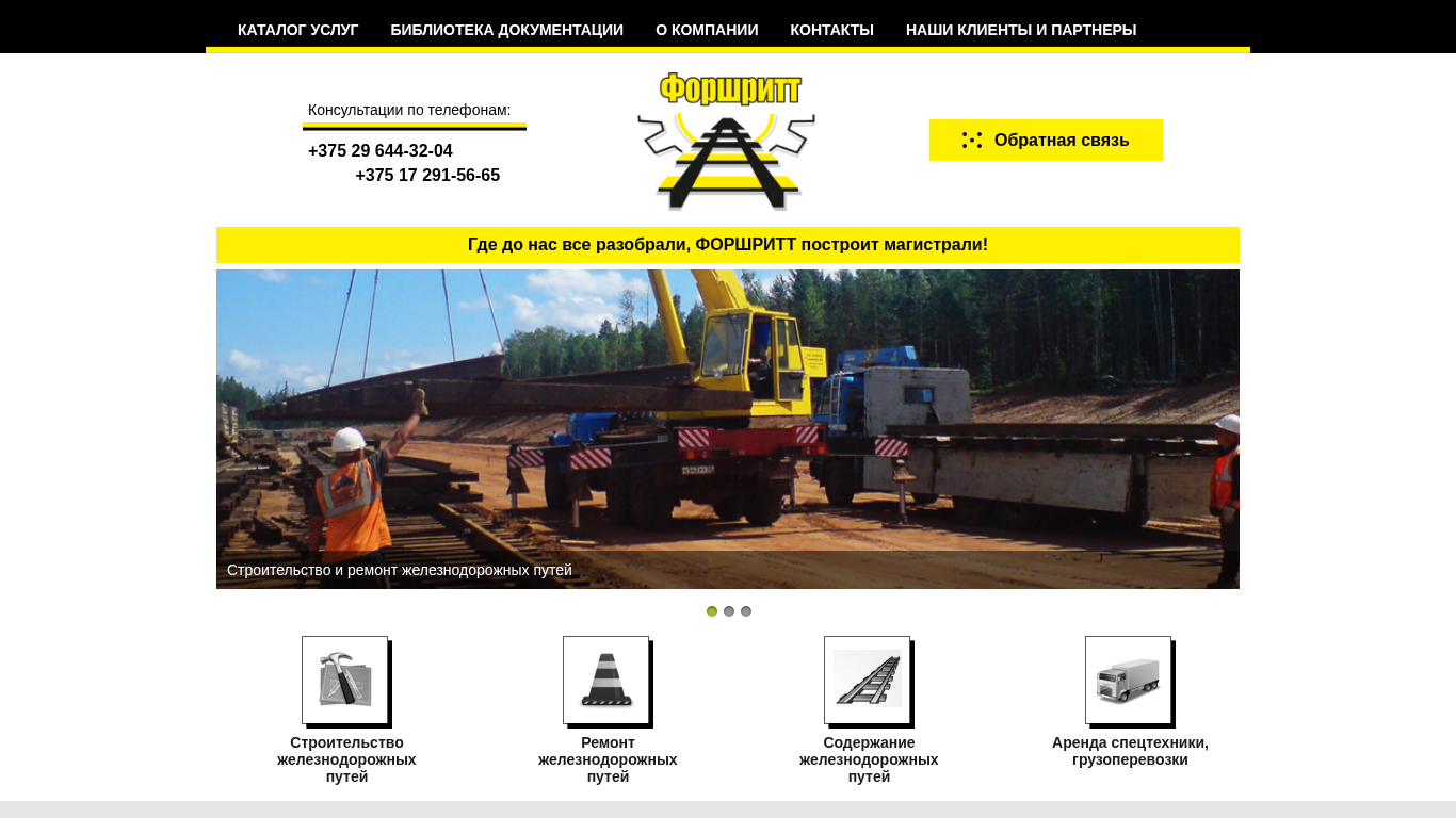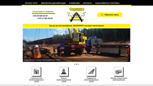 This website is dedicated to the services provided by the Belarusian limited liability company "Форшритт" in the field of railway infrastructure. The company specializes in the repair and maintenance of railway tracks, including the installation of rails and sleepers, as well as the alignment and leveling of tracks. Other services offered include the installation of turnouts and crossings, and the maintenance of the overall condition of the railway tracks. The website includes a catalog of services, a company profile, contact information, and a map of the railway network in Belarus. The company has been successfully operating in the railway construction industry since its inception and holds the necessary certifications to carry out the work.