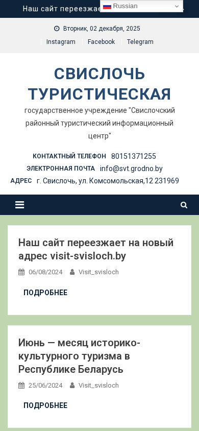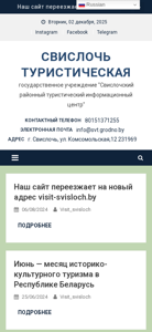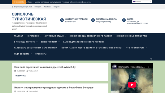 | AI-анализ | This online resource is the official website for the "Svisloch Tourist Information Center," a state-owned institution in the Svisloch region of Belarus. The website provides information on local tourism, including news, events, and a directory of tourist attractions and accommodations. In June, the center launched a social media campaign called "Discover Belarus," and the website is moving to a new address: visit-svisloch.by. The site includes sections on the region's history, culture, and active recreation opportunities, as well as contact information for tour guides and excursion routes. Tourists can find information on local points of interest, such as monuments, churches, museums, and souvenir shops. The website also lists various types of tourism, including business, agro, and educational, and provides a calendar of upcoming events. Additionally, the site offers information |