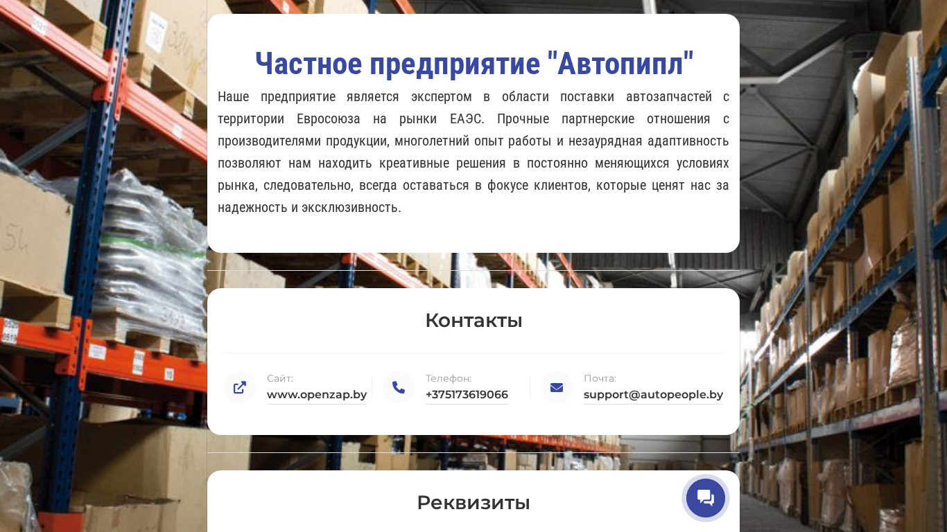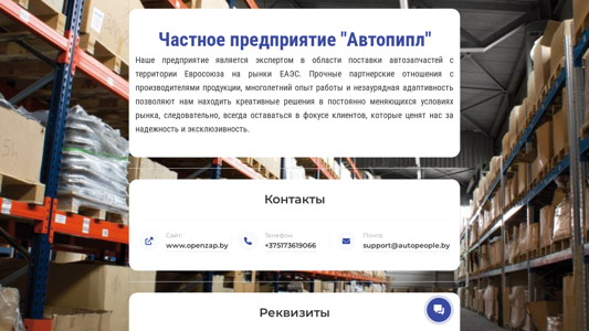 | AI-анализ | The portal is a business website for "Автопипл" (Autopeople), a private enterprise based in Minsk, Belarus. The company specializes in supplying automotive parts from the European Union to markets within the Eurasian Economic Union. Strong partnerships with manufacturers, extensive experience, and adaptability enable the company to offer creative solutions in a constantly changing market and maintain clients who value reliability and exclusivity. Contact details include a website (<www.openzap.by>), phone number (+375173619066), and email (support@autopeople.by). The company's full name is "Частное торговое унитарное предприятие "Автопипл" (Private Trade Unitary Enterprise Autopeople), registered on December 13, 2007, with the UNP |