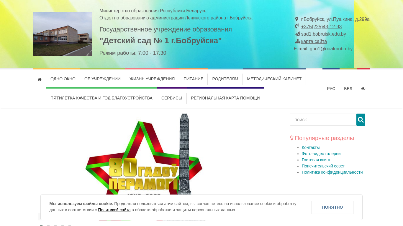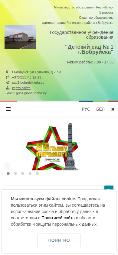 | Адрес | Государственное учреждение образования, "Детский сад № 1 г. Бобруйска, ", Режим работы: 7.00 - 17.30, г. Бобруйск, ул. Пушкина, д.299а |