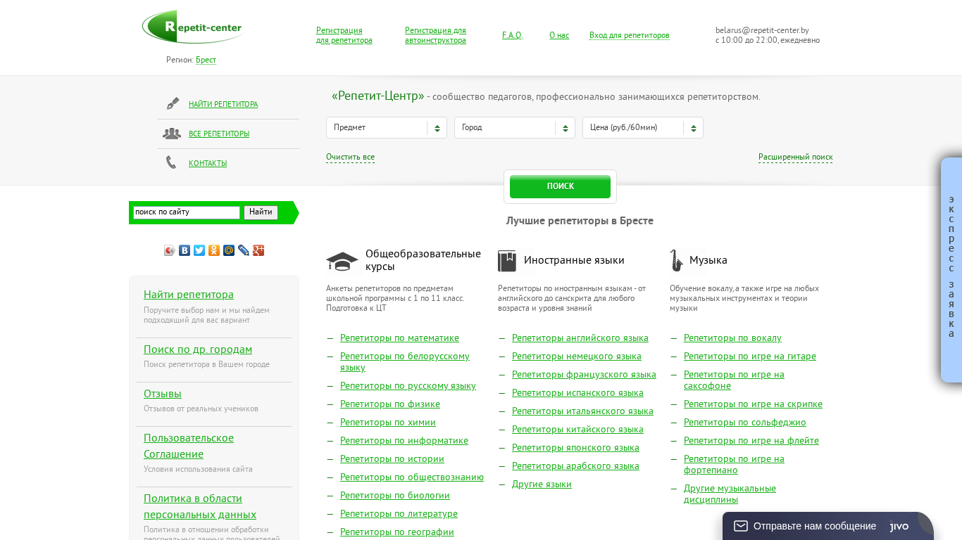 | SEO-описание | Поиск среди лучших репетиторов в Бресте. Цены от 12 руб., проверенные отзывы! Бесплатный и удобный поиск! |