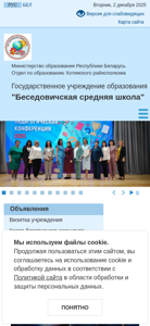 The web project "Беседовичская средняя школа" (<besedovichi.hotimsk.edu.by>) is a website of a state educational institution located in the Hotimsk region of Belarus. The title of the site is "Беседовичская средняя школа" which translates to "Besedovich Secondary School". The description section of the site contains no specific information. The keywords and top_words indicate that the site includes information about the school's schedule, contacts, and FAQ section, as well as articles and news. The site also features a rating portal, a portal for citizens and legal entities to make inquiries, and information about the school's administration and structure. The site is operated by the Ministry of Education of the Republic of Belarus and the Hotimsk Regional Executive Committee. The site is accessible in one