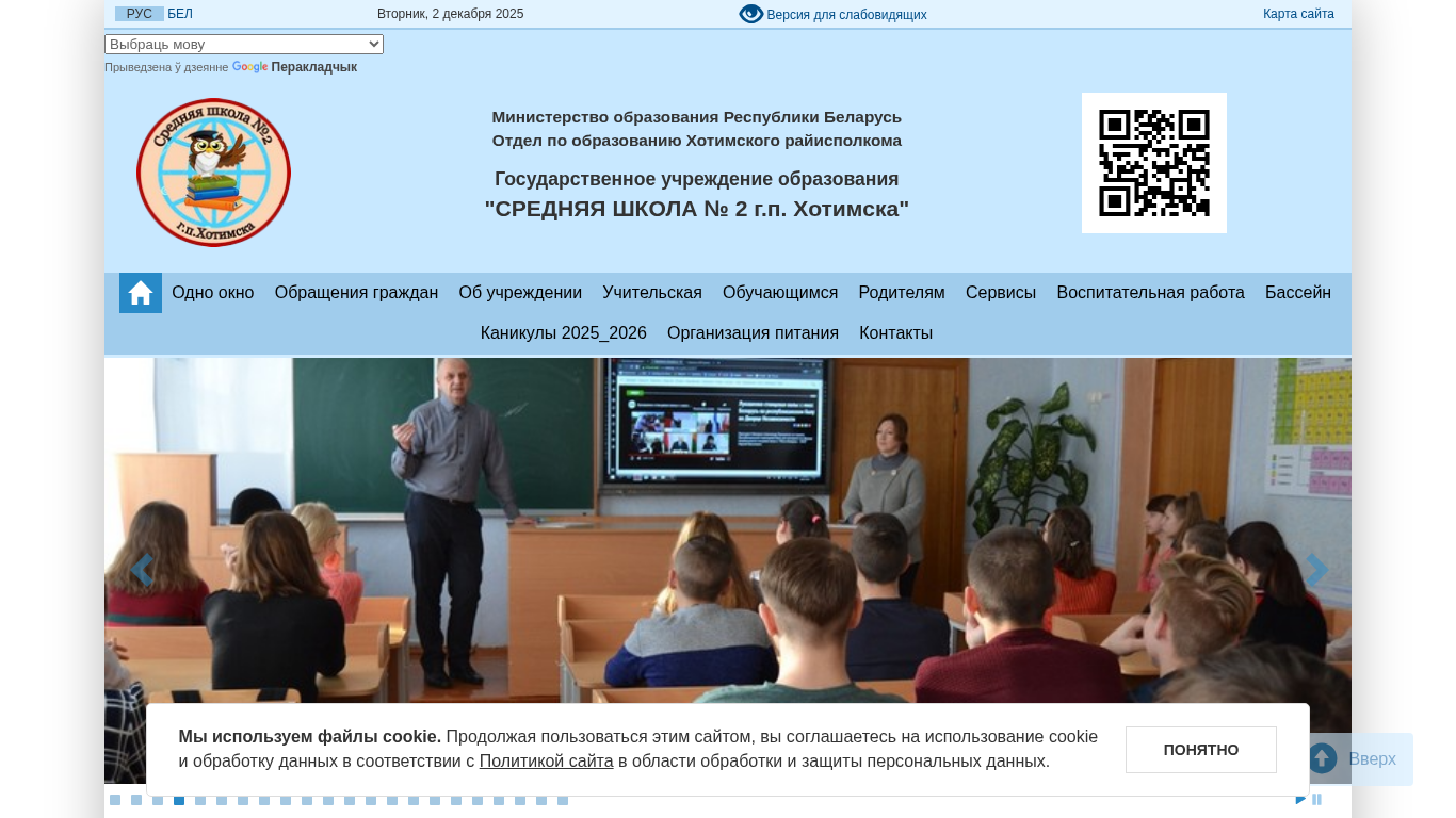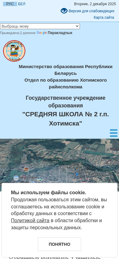 | AI-анализ | The portal sch2.hotimsk.edu.by is a website for Middle School No. 2 in the town of Hotimsk, Belarus. The title of the page is "Средняя школа № 2 г.п. Хотимска" (Middle School No. 2 in the town of Hotimsk). The description includes information about the school and its location in Belarus. The website uses cookies and has options to change the font size, language, and image display. The size and inter-letter spacing of the text can also be adjusted. The website's color scheme is customizable, and users can choose between black and white or color images. The menu provides access to various sections of the site, including a language selection feature with options for Belarusian and other languages. The date displayed is December 2, 2025, and the site |