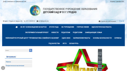 --- This online resource belongs to the official website of Kindergarten No. 51 in the city of Grodno, Belarus. The title of the website is "Детский сад № 51 г.Гродно" (Childcare Center No. 51 in the city of Grodno). The description section includes information about the 80th anniversary of the liberation of Belarus from Nazi occupation and the Victory Day. The keywords consist of words related to the kindergarten, education, Belarus, news, Grodno, more details, safety, December, liberation, Belarus, victory, people, great, fatherland, working conditions, MChS, November, improvement, logo, childcare, 3. The top words are "2025", "education", "Belarus", "news", "Grodno",