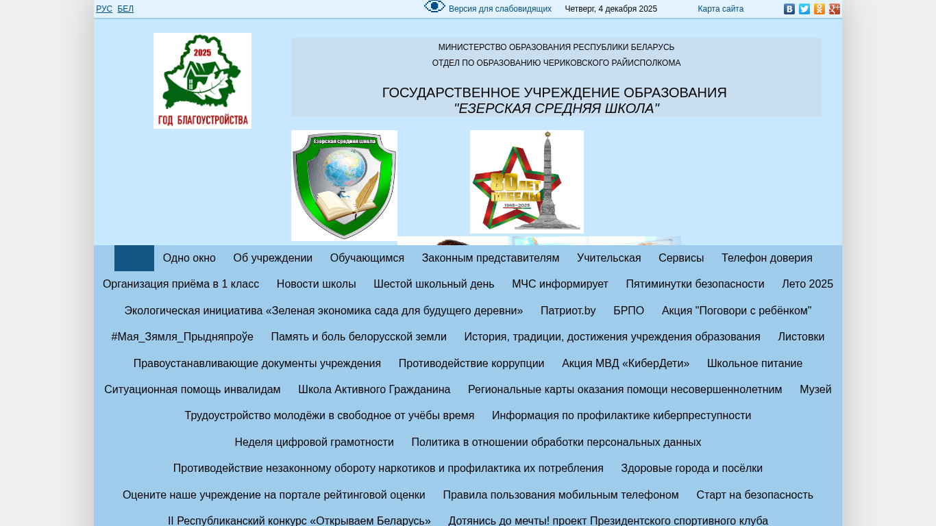 | AI-анализ | The website "Езерская средняя школа" (Ezery Middle School) is a Belarusian educational institution with the domain name ezery.cherikov.edu.by. The title of the website translates to "Ezery Middle School" in English. The description contains keywords related to education, Belarus, and safety. The top words include "при" (if), "беларусь" (Belarus), "республики" (republic), "безопасности" (safety), "образования" (education), and "детей" (children). The website may also mention the year 2025, as it appears in the top words with a frequency of 31. The domain is registered under the "cherikov.edu.by" domain, suggesting it is affiliated with the Cherikov Educational |