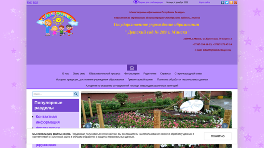 | AI-анализ | The web project "ДС 289" is a Belarusian educational website focused on news, institutions, and early childhood education. The title and top keywords suggest that it is a part of a larger organization or ministry, possibly related to education in Minsk, Belarus. The website uses cookies and has options for changing language and font settings. The top words include "education," "news," and "children," with specific mentions of "preschool institutions" and "creativity." The domain name "ddu289.minsk.edu.by" indicates that it is likely a subdomain of the Minsk educational system. |