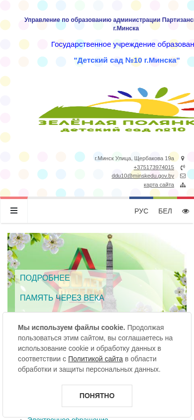 | Адрес | Партизанского района г. Минска, Государственное учреждение образования, "Детский сад №10 г. Минска", г. Минск Улица, Щербакова 19а |