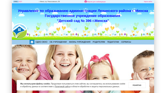 | AI-анализ | This website is for the state educational institution "Detsky Sad No. 396 g.Minsk" in the Leninsky district of Minsk, Belarus. The title of the website is "Детский сад № 396 г.Минска" (Children's kindergarten No. 396 in Minsk). The description includes information about the use of cookies and a link to the site's policy on data processing. The top words indicate that the site contains information about the kindergarten's location, management, schedule, and administrative procedures. The keywords include "children's kindergarten," "Minsk," and "education institution." The website also includes links to resources related to education in Belarus and disability assistance. The domain is ddu396.minsk.edu.by. |