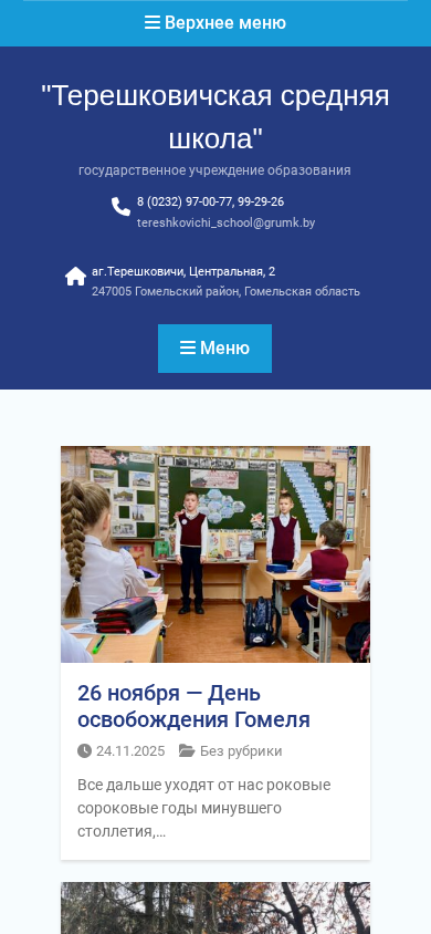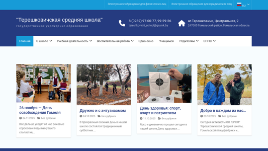 | AI-анализ | The portal "Терешковичская средняя школа" is the official website of the state educational institution "Терешковичская средняя школа." It provides information about the school, its history, administration, and educational activities. The menu includes sections on the school's profile, admissions, business style, curriculum, and various events. The website also features sections for students and parents, including a parent university and a help center for the Goмель city police. The school's contact information is provided, including a phone number and email address. The website is available in Russian and Belarusian languages. |