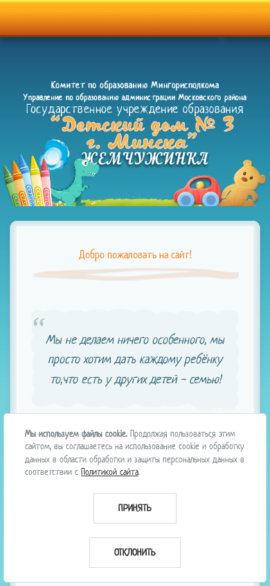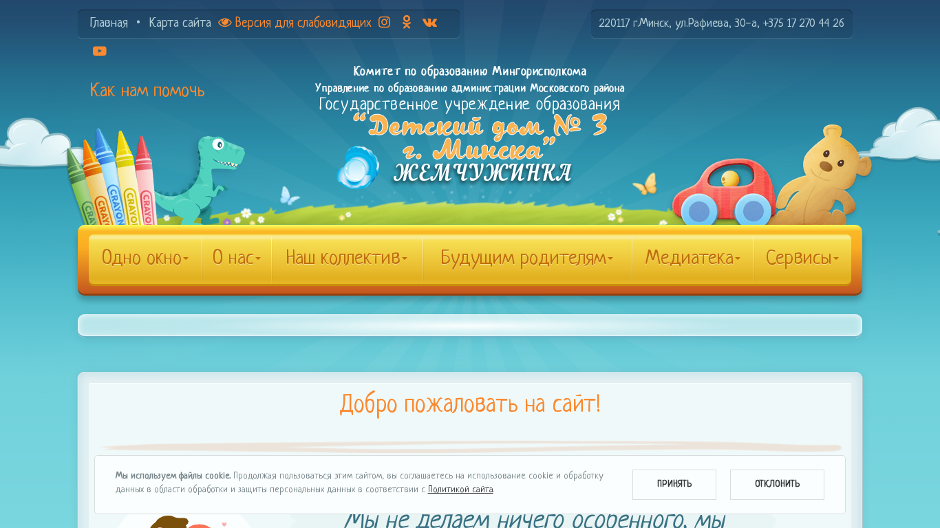 | AI-анализ | The web project "Детский доm №3 г. Минска" (Children's Home №3 in Minsk) provides information about the institution, its administration hours, contact details, and various services. Key topics include administrative procedures, forms, electronic application, popular requests, important documents, and vacancies. The website also offers information on improving living conditions for large families, job openings, and the history and traditions of the institution. It includes sections on various groups, educational programs, and a methodological cabinet. The website is operated by the administration of the children's home and features information on their teams, including pedagogical and medical personnel. Additionally, it includes a patronage council, a colleague roster, and a calendar of news. The site offers resources on various topics such as child safety, vaccinations, cyberbullying, and inspections. It also includes links to various organizations and campaigns |