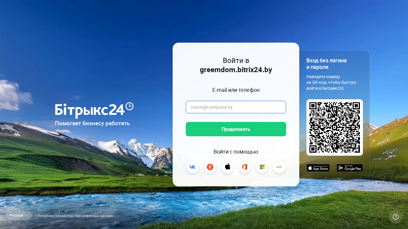 Сайт greemdom.bitrix24.by представляет собой веб-портал для входа в платформу Bitrix24, предназначенную для повышения продуктивности бизнеса. Пользователи могут войти на сайт с помощью своей электронной почты или номера телефона, а также используя сканнер QR-кода для быстрого доступа к платформе без необходимости ввода логина и пароля. На сайте также размещена ссылка на политику конфиденциальности Bitrix24, касающуюся обработки личных данных.