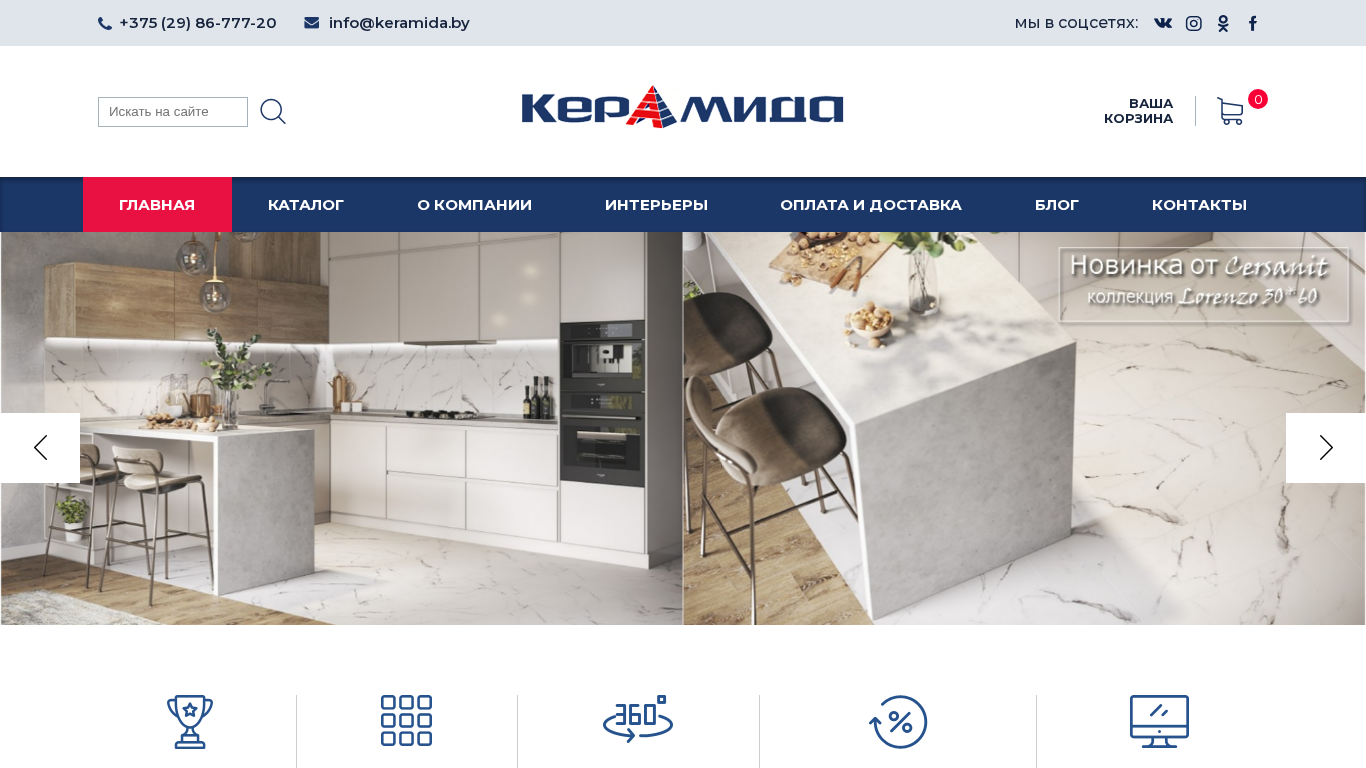 | SEO-описание | ЗАО «Торговый дом КерАмида» специализируется по продаже керамической плитки в городах Брест и Пинск (плитки для ванной, для пола, для кухни), керамического гранита, мебели для ванной, душевым кабинам, зеркалам и другим аксессуарам для ванной комнаты. |