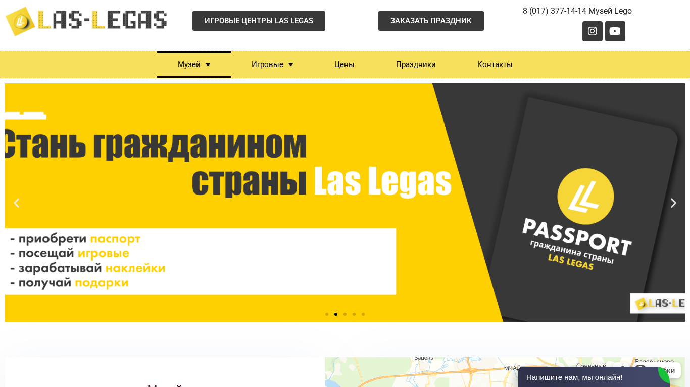 | AI-анализ | The portal Las-legas is a private museum in Minsk, Belarus, dedicated to Lego. Affordable admission tickets, birthday services, and gaming rooms are offered. The museum is located at Prospect of Victors, house 133A. It opens from Monday to Saturday from 12:00 to 20:00 and on Sundays and holidays from 11:00 to 20:00. For gaming rooms, there are separate phone numbers and addresses: DiamondCity, Palazzo, Lebyazhiy, Titan, and Pobeiditelei 133A (Lebyazhiy district, Yaкуба Коласа 1). Admission to the museum is valid for the day, while gaming room payment is hourly. Discounts for large families are available upon presentation of documentation. People with disabilities, |