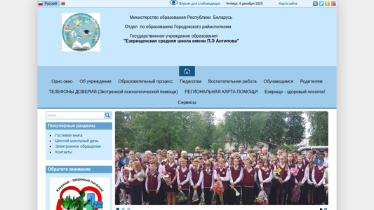 | AI-анализ | The website is the official site of "Ezerishchenskaya Srednya Shkola imeni P.E. Antipova" (Ezerishchenka Middle School named after P.E. Antipov), located in the city of Gorodok, Belarus. The site provides information on the educational process, pedagogy, and extracurricular activities of the school. It includes sections on school administration, services, popular topics, and news. The news section covers events at the school, in the republic, and in the region. The site also features a contact section and an archived news section. On December 1, 2025, the students of the school participated in the International AIDS Day campaign "Red Ribbon". The site is available in Russian and has a standard layout with adjustable font size and line spacing. It contains images and is optimized for |