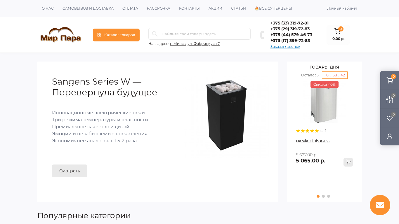 | SEO-описание | Интернет-магазин Mir-para.by - поможет Вам купить товары для бани и сауны, оборудования для отопления частного дома или дачи по самым низким ценам. Фото, описание, характеристики, отзывы — Смотрите в каталоге магазина! Доставка по Минску и Беларуси. |