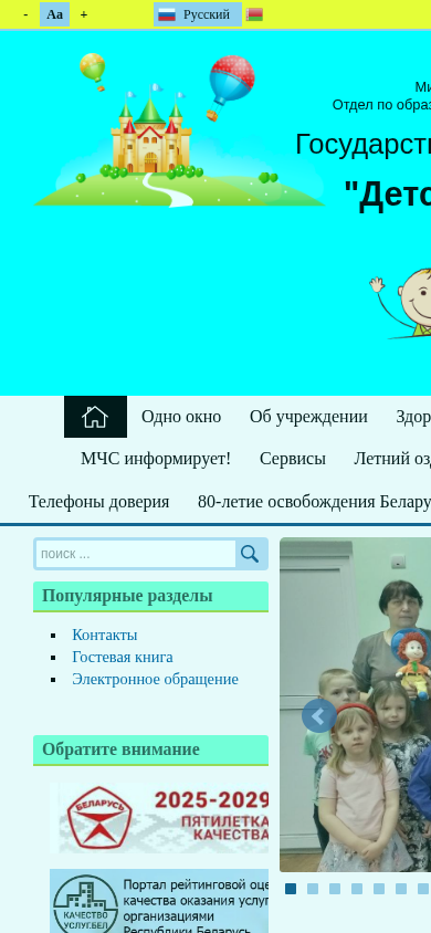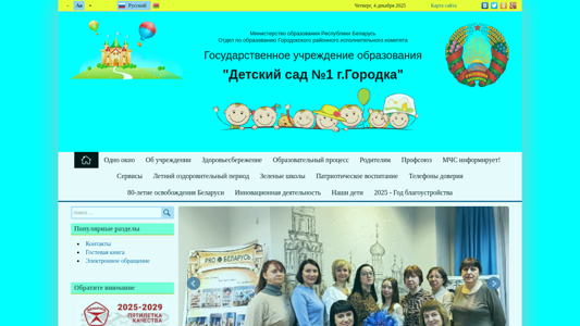 | AI-анализ | The portal sad1.gorodok.edu.by is the official website for the Kindergarten No.1 in the city of Gorodok, Belarus. The site includes information about the kindergarten's educational process, health and safety measures, parent-teacher relations, and contact details. The most popular sections are "Parents," "Health and Safety," and "Contacts." Users can also find news, information about innovative activities, and a guestbook. The site also provides a form for electronic inquiries and a poll about additional educational services. The Ministry of Education of the Republic of Belarus and the City of Gorodok's Educational Department are mentioned, along with information about the kindergarten's history and milestones. The site is accessible from Monday to Friday, 8:00-17:00, and has a phone number for reporting child welfare |