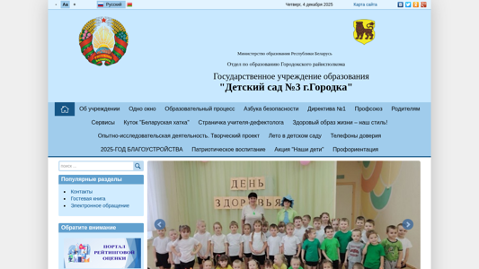 | AI-анализ | The web project "Ясли-сад №3 г.Городка" (Preschool №3 in the city of Gorodok) is a website belonging to a state educational institution in Belarus. The site offers information about the preschool, its educational process, and various services. The main page includes links to sections on the preschool's mission, its staff, and health and safety initiatives. The site also features a section for parents, where they can express their opinions on the quality of the educational process, nutrition, and facilities through an online survey. Additionally, there is a section for teachers, and the site has a news section, with articles on various topics related to education and child development. The site also contains information about the preschool's partnership with the city's educational and administrative bodies, as well as contact information. The site is currently promoting a campaign on fire safety and the |
