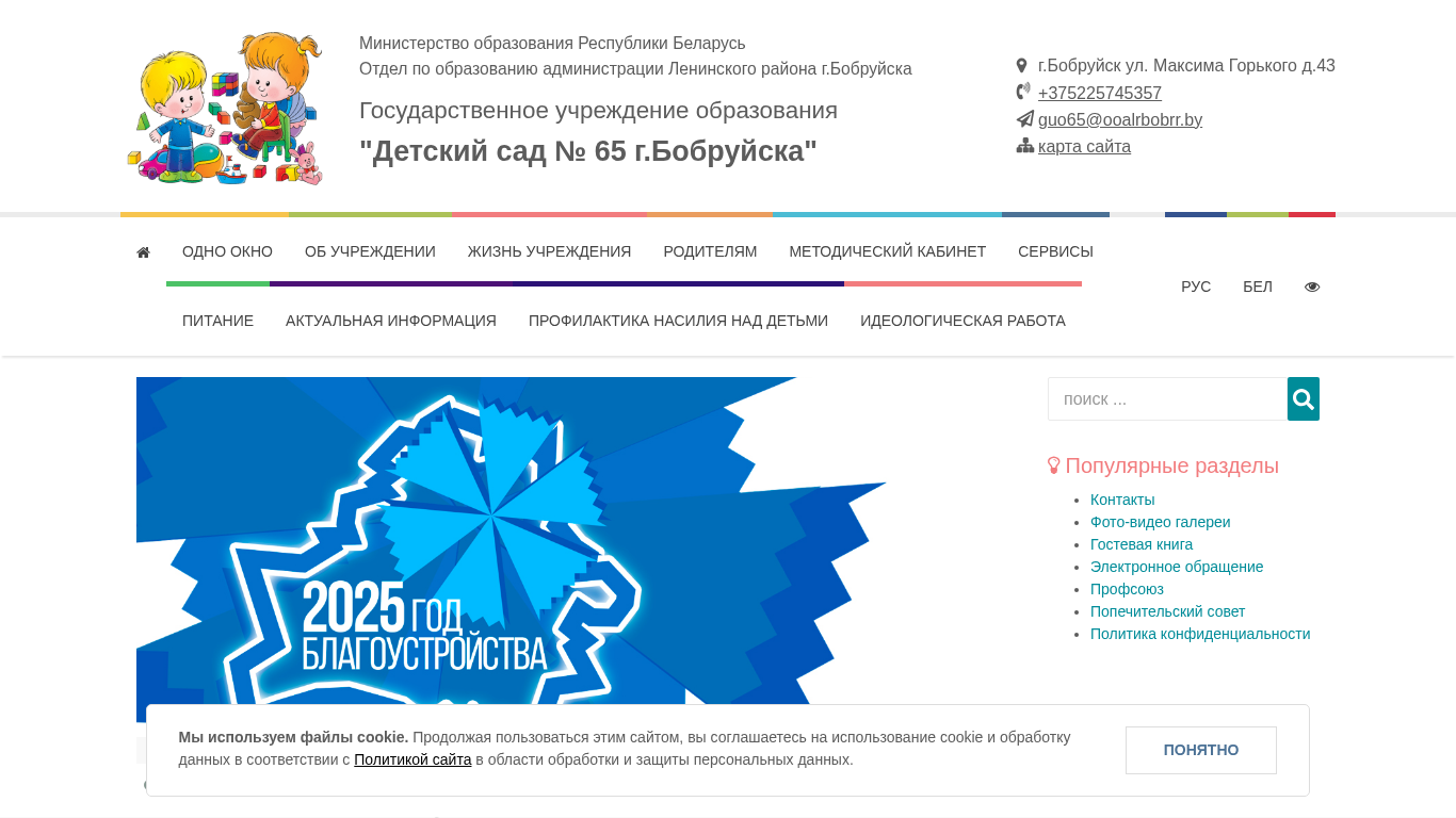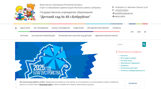 | AI-анализ | --- The website is for Kindergarten No. 65 in Bobruisk, Belarus, operated under the Ministry of Education of the Republic of Belarus and the administration of the Leninsky district of Bobruisk city. It provides information on the kindergarten's administrative procedures, schedules, contact details, and educational documents. The site includes a map of the kindergarten, details on the leadership team, and a virtual tour. Additionally, there are sections for parents, such as advice from psychologists and defectoologists, a parent council, and information on fees and school schedules. The site offers interactive features, including an electronic application system, and downloadable forms for various administrative procedures. There are also sections on the kindergarten's history, goals, and structure, as well as a news section and a directory of contacts. The site is designed to facilitate communication and access to information for parents |
