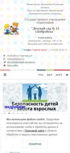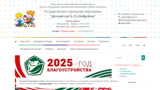 | AI-анализ | The website is for the "Detsky Sad No. 13" kindergarten in Bobruisk, Belarus. It is a state educational institution under the Ministry of Education of the Republic of Belarus, managed by the education department of the Pervomaisky district administration in Bobruysk. The website provides detailed information about the kindergarten's administration, schedule, contacts, and various procedures. Users can find information about the kindergarten's regime, leadership, structure, and services. The website also offers interactive maps of the educational network in the Mogilev region and the city of Bobruysk. Additionally, there is information about the kindergarten's admission process, health and safety guidelines, and various educational programs. The contact information includes a "hotline" phone number and an email address. The website is part of the state educational network and is governed by relevant legal documents. |